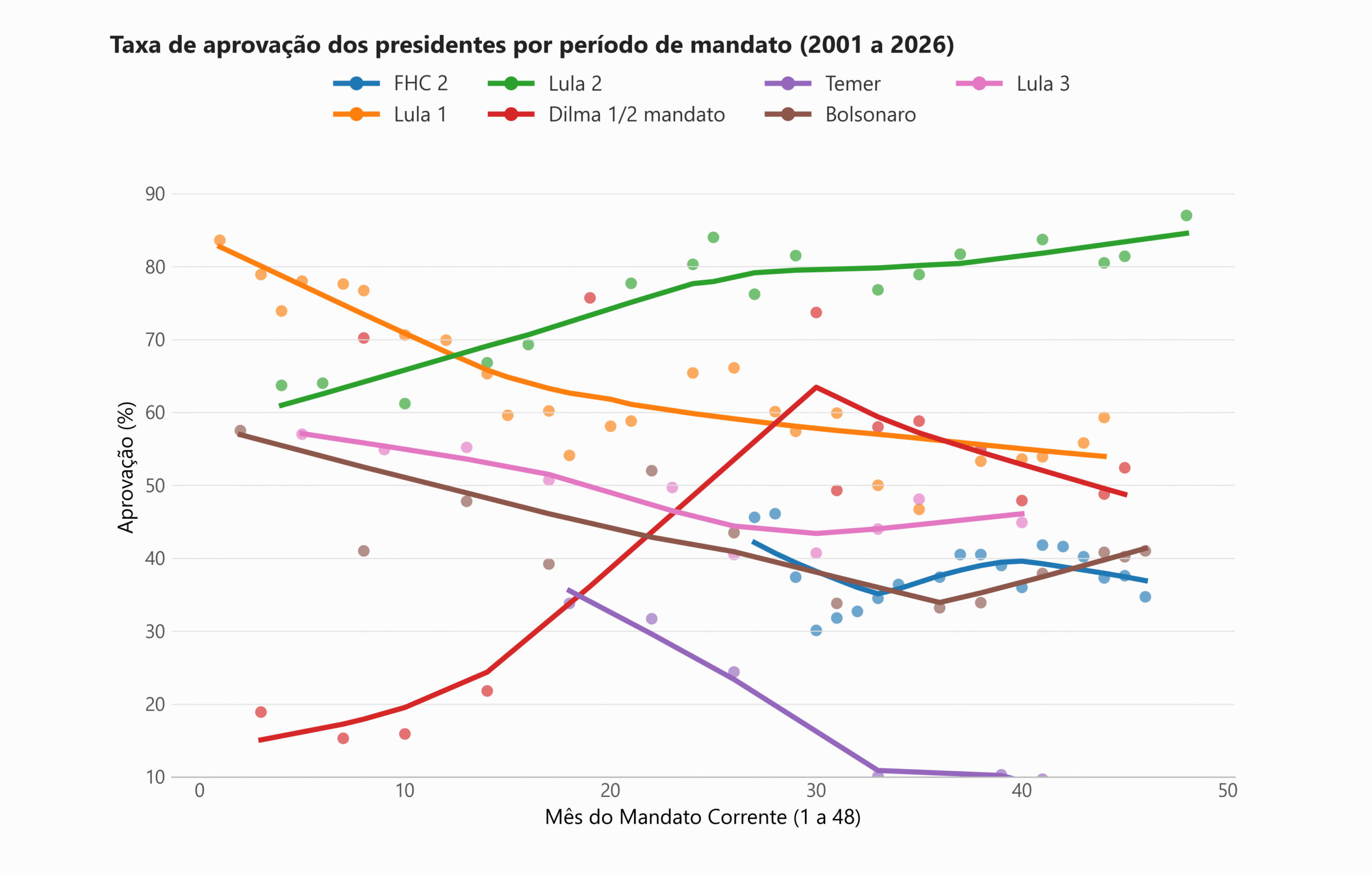 A curva do desgaste: a relação entre calendário e popularidade dos presidentes entre 2001 e 2026