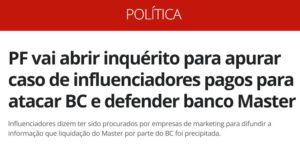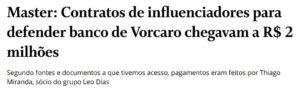 Considerando esse modelo, o caso do Banco Master se enquadraria no tipo 8 e também 16: um grupo de interesse que buscou financiar influenciadores para persuadir o público/atores políticos sobre possíveis irregularidades na ação do Banco Central. A finalidade, ao que tudo indica, foi descredibilizar a ação do BC e beneficiar grupos políticos e o Banco Master, que têm interesse que a liquidação não seja efetivada.
