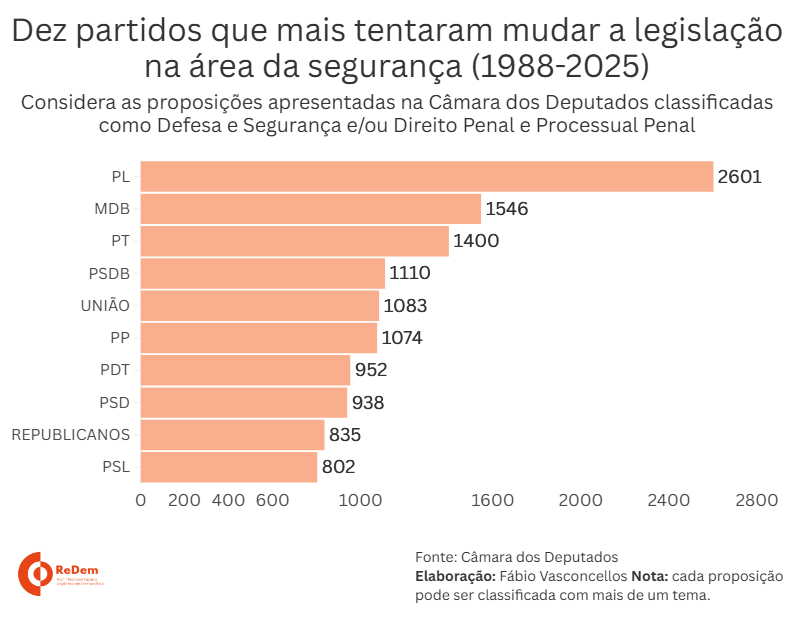 Em todo período pós-1988, o PL foi o partido que mais procurou mudar a legislação na área da segurança. Entre as dez legendas que lideram a lista, o partido do ex-presidente Jair Bolsonaro apresentou proposições classificadas mais de 2,6 mil com essa temática, isto é, considerando “Defesa e Segurança” ou “Direito Penal e Processual Penal” ou simultaneamente (no gráfico, os dados do antigo PR foram incorporados ao PL). Depois do PL, vem o MDB e o PT como partidos com o maior número de tentativas.
