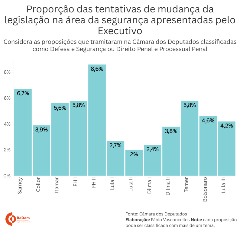 Do total de propostas apresentas por FH II, cerca de 8,6% abordaram o tema da segurança. Essa é maior taxa de todos os governos desde 1988. Após o segundo mandato de FH, os percentuais ficaram abaixo de 6%. A proporção mais baixa foi registrada para Lula II, com apenas 2% das propostas do governo tendo a segurança como tema. Essa taxa sobe com Temer para 5,8%, cai um pouco no governo Bolsonaro (4,6%) e, até momento, está em 4,2%.