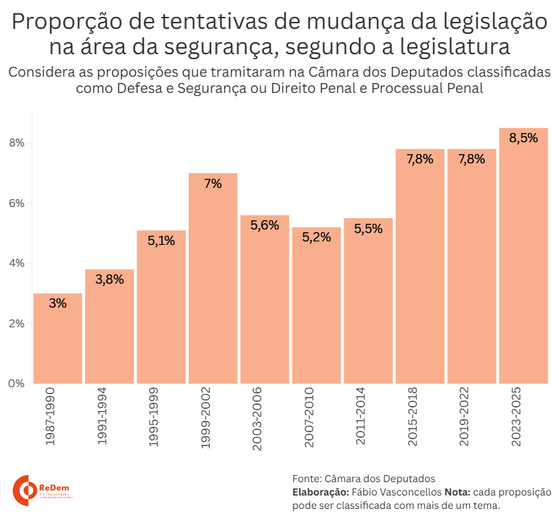 A tendência de alta se reflete também quando observamos a proporção das medidas comparadas ao total de propostas que deram entrada na Câmara dos Deputados desde 1988. Esta legislatura (2023-2025) registra o maior percentual, com 8,5% dos casos. Na série, as proporções vinham subindo desde o período 2015-2018, com 7,8%. Esse percentual se repetiu na legislatura 2019-2022, e agora foi superado.