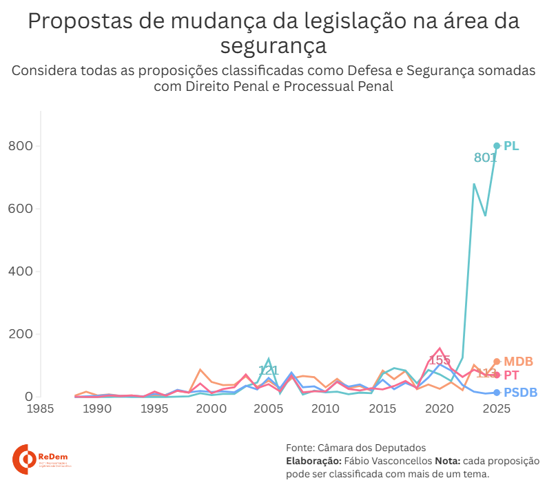 Desde então, o PL passou a liderar a quantidade de propostas com foco na segurança, principalmente após Jair Bolsonaro chegar à Presidência, juntamente com grande número de deputados federais do PSL, legenda pela qual o ex-presidente foi eleito em 2018. Com a saída de Bolsonaro do PSL, boa parte dos deputados migraram com o ex-presidente para o PL no fim de 2021.