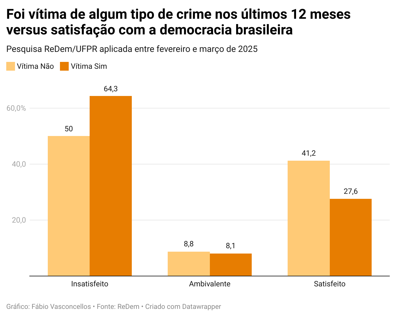 O que os dados do ReDem mostram. Entre os brasileiros que tiveram familiares vítimas de violência, o percentual de insatisfação com a democracia era de 64,3% (insatisfeito + muito insatisfeito) — cerca de 14 pontos percentuais acima do grupo também insatisfeito mas que não teve um familiar vítima de violência.