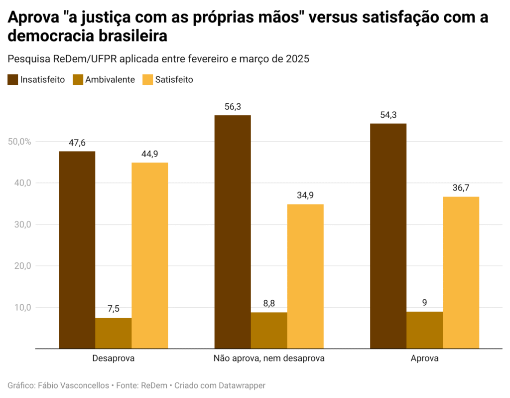 Quando perguntados se aprovam ou desaprovam que um pai pudesse matar o estuprador da filha, cerca de 47,6% dos entrevistados que desaprovam essa medida se disseram insatisfeitos ou muito insatisfeitos com a democracia. Já no grupo dos que aprovavam a ação, a insatisfação com a democracia chegou a 54%. Inversamente, quanto mais satisfeitos com a democracia, menor o apoio à justiça com as próprias mãos.
