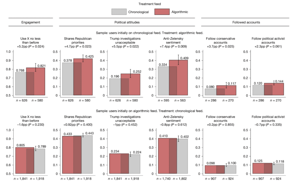 Com isso, a pesquisa mediu as mudanças em atitudes políticas e no comportamento online, especificamente na decisão de seguir novos perfis. A abordagem permitiu ainda identificar como a curadoria automatizada atua como um filtro ativo na formação de opinião, isolando variáveis que experimentos puramente observacionais não conseguem capturar com tamanha precisão.