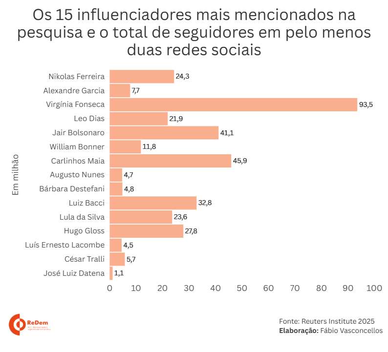 Em mercados como Brasil, México, Indonésia e Estados Unidos, personalidades do ambiente digital já capturam mais atenção do público do que marcas jornalísticas tradicionais. A ascensão dos influenciadores como mediadores da realidade política e social redefine não apenas o consumo de notícias, mas também os mecanismos de formação da opinião pública.