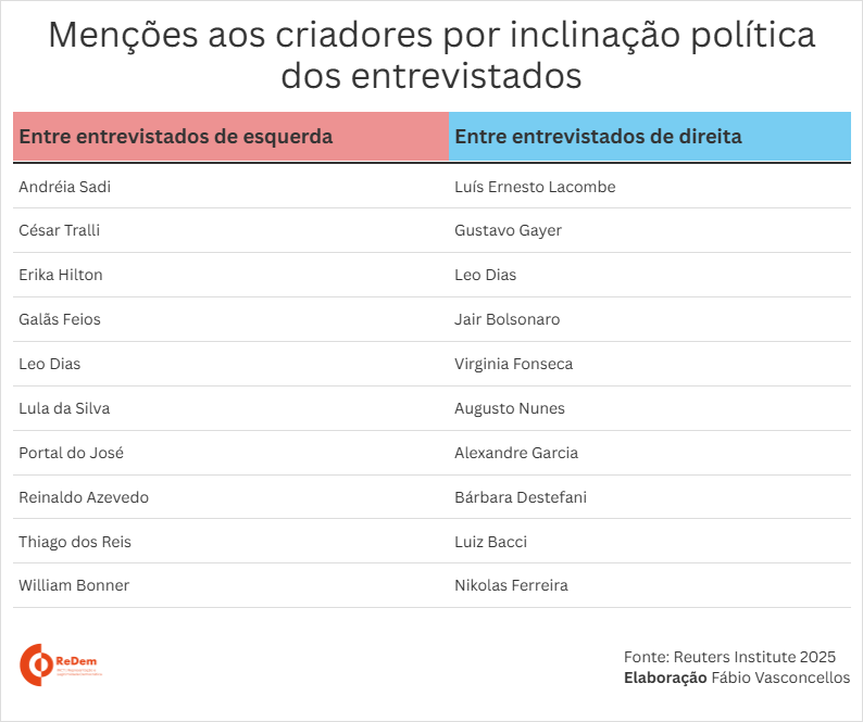 Essa divisão entre criadores digitais preferidos pela esquerda e aqueles preferidos pelos cidadãos que se identificam como o campo da direita tem implicações: enquanto a esquerda pode ser parcialmente alcançada por canais institucionais, a direita exige engajamento direto com influenciadores. A assimetria força uma abordagem segmentada e deliberada por parte de comunicadores, jornalistas e estrategistas.