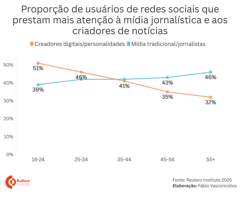Em nível global, os usuários com menos de 35 anos, 48% consomem notícias por meio de criadores, superando os 41% que recorrem à mídia tradicional. O padrão se inverte entre os mais velhos, com 44% ainda preferindo veículos jornalísticos.