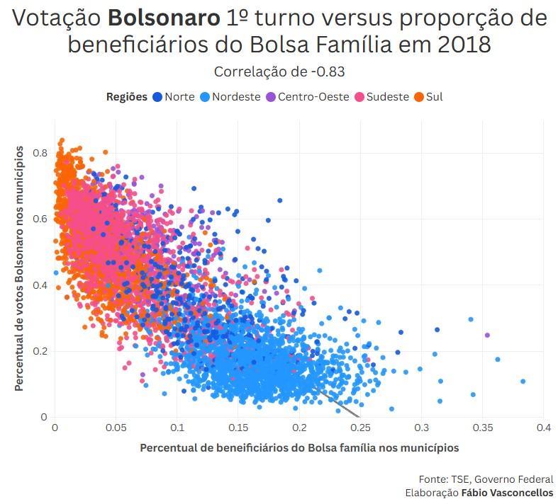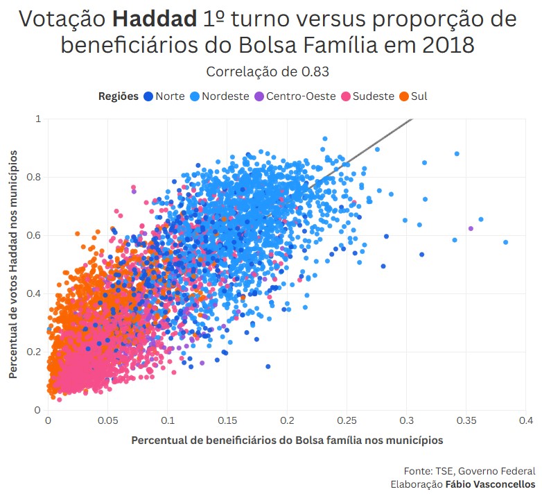 A votação de Fernando Haddad (PT) apresentou novamente uma alta associação positiva com a proporção de beneficiários do Bolsa Família (0,83). Bolsonaro, por sua vez, registrou uma relação negativa, isto é, quanto maior a proporção de beneficiários do Bolsa em uma cidade, menor foi o percentual de votos no então candidato do PSL.
