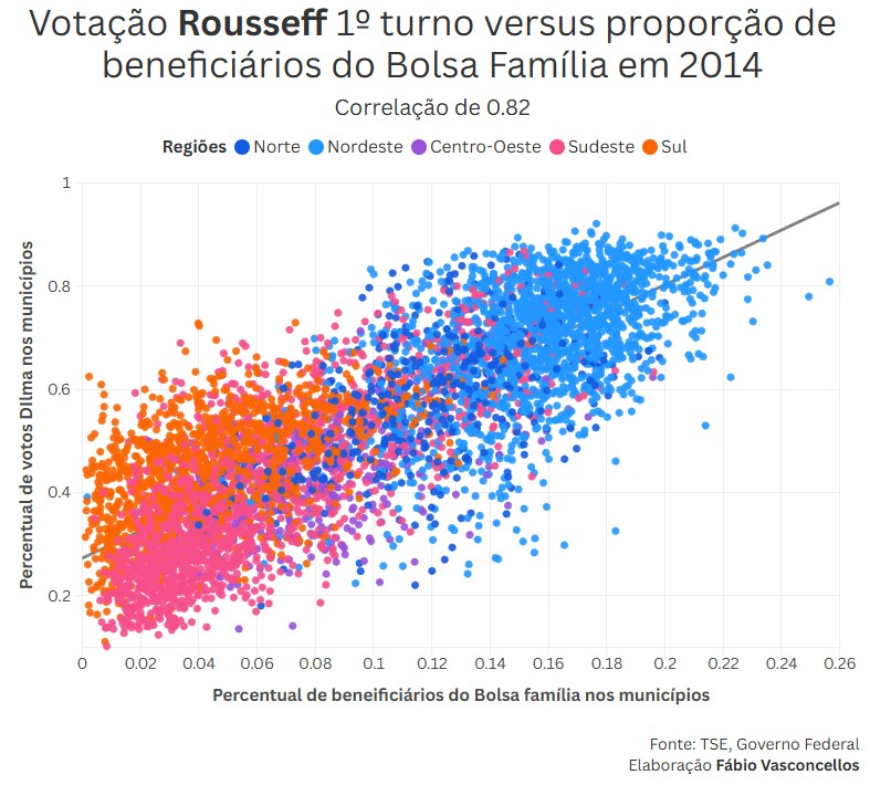 Na eleição de 2014, houve uma associação positiva e bastante elevada (0,82) entre a proporção de votos da então presidente Dilma Rousseff e o percentual de beneficiários nos mais de 5 mil municípios. Quanto maior o percentual de beneficiários, maior foi a proporção de votos em Dilma. Essa distribuição foi exatamente o oposto para o principal candidato de oposição na época, Aécio Neves (associação -0,82).